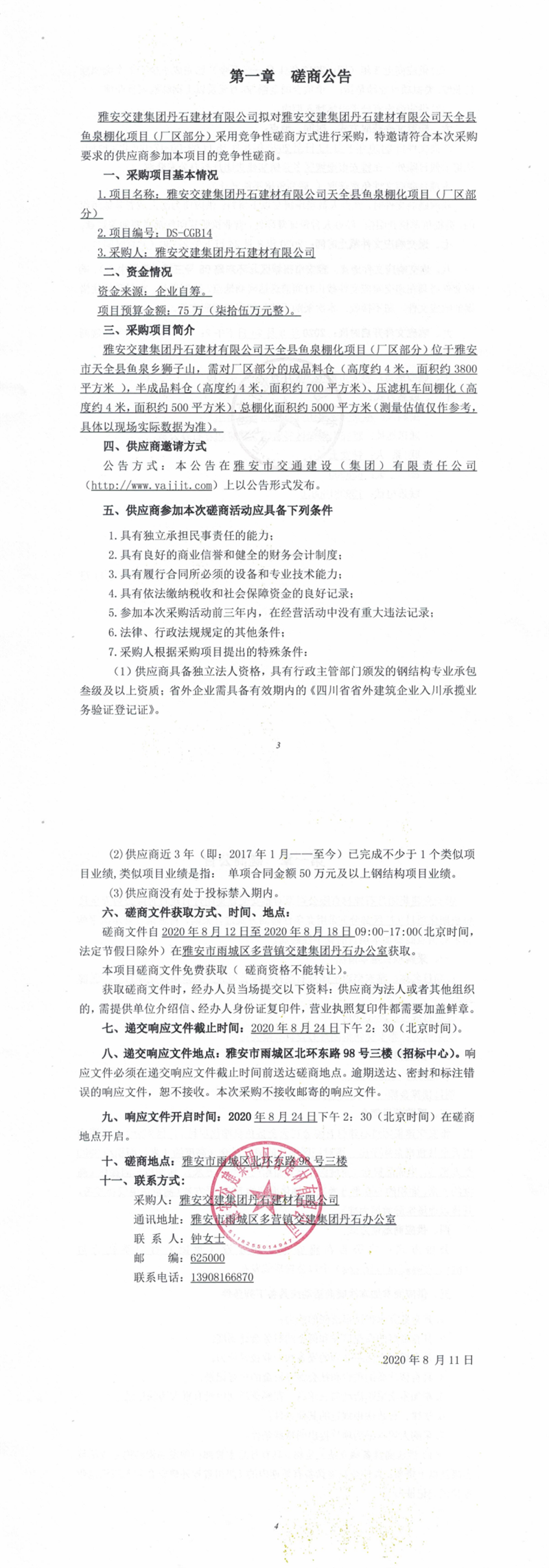 雅安交建集團丹石建材有限公司天全縣魚泉棚化項目(廠區(qū)部分)競爭性磋商公告