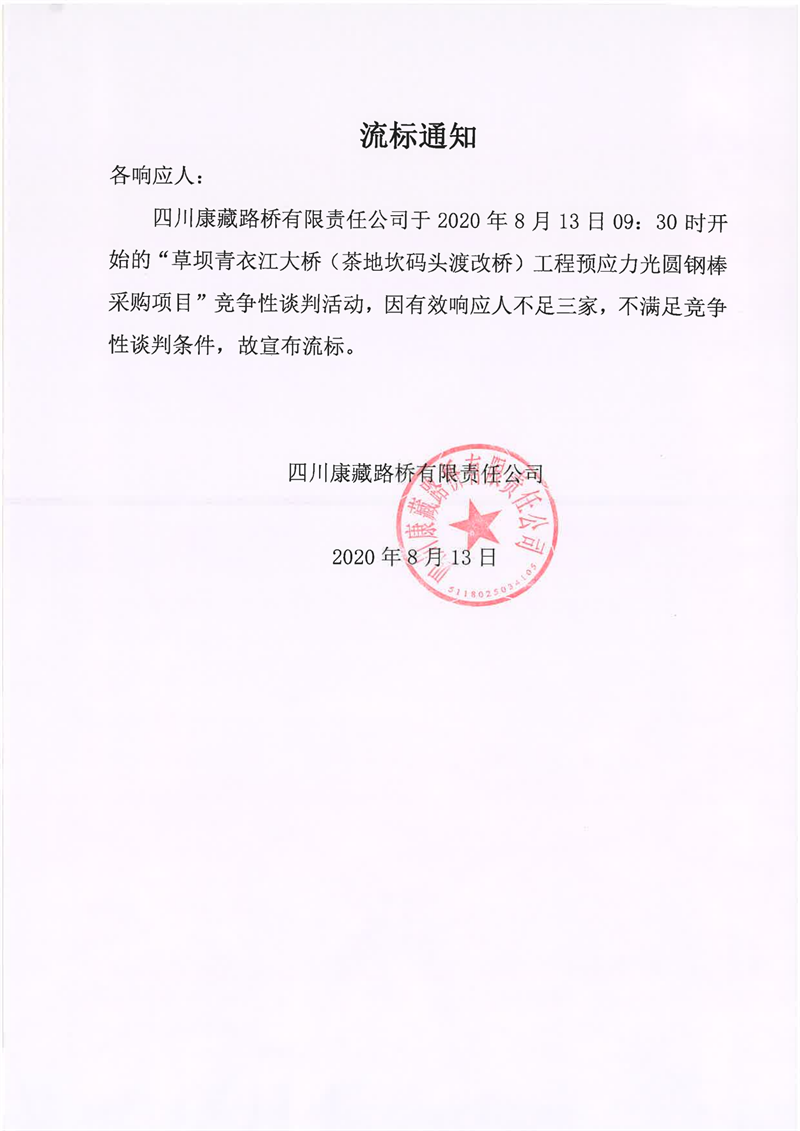 四川康藏路橋有限責任公司草壩青衣江大橋(茶地坎碼頭渡改橋)工程預應力光圓鋼棒采購項目流標通知