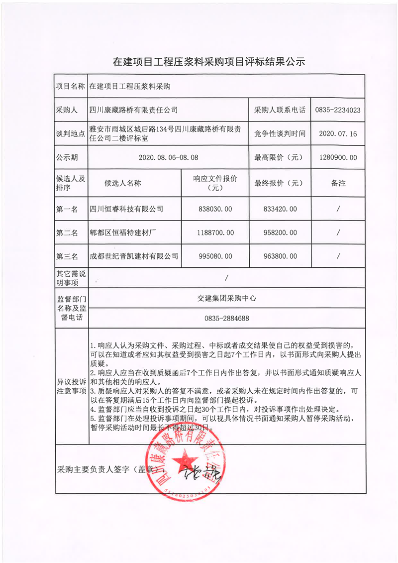 四川康藏路橋有限責(zé)任公司在建項目工程壓漿料采購評標(biāo)結(jié)果公示