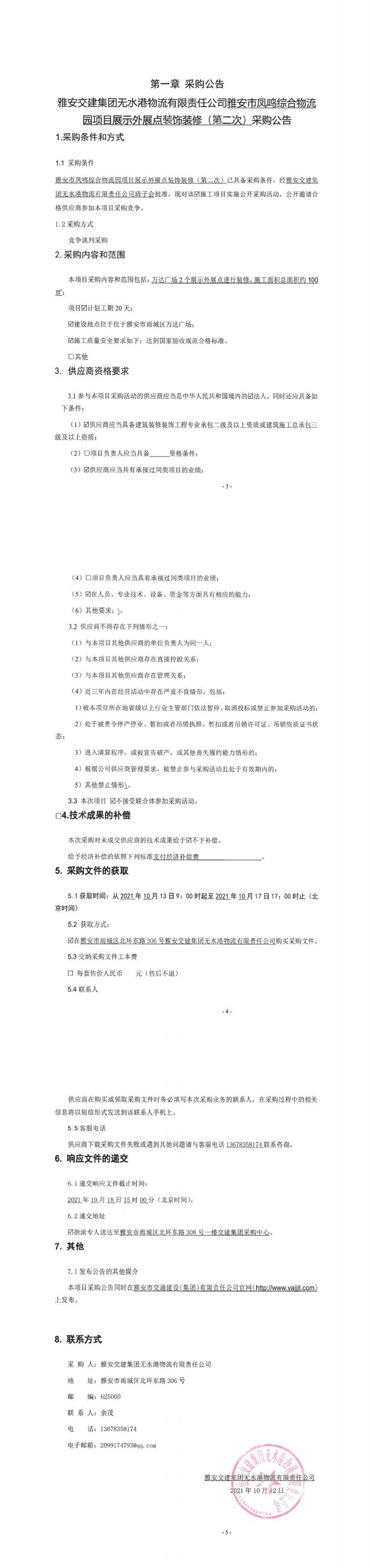 雅安交建集團(tuán)無水港物流有限責(zé)任公司雅安市鳳鳴綜合物流園項(xiàng)目展示外展點(diǎn)裝飾裝修(第二次)采購公告
