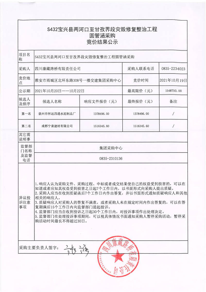 四川康藏路橋有限責任公司S432線寶興縣兩河口至甘孜界段災(zāi)毀修復(fù)整治工程圓管涵采購競價結(jié)果公示