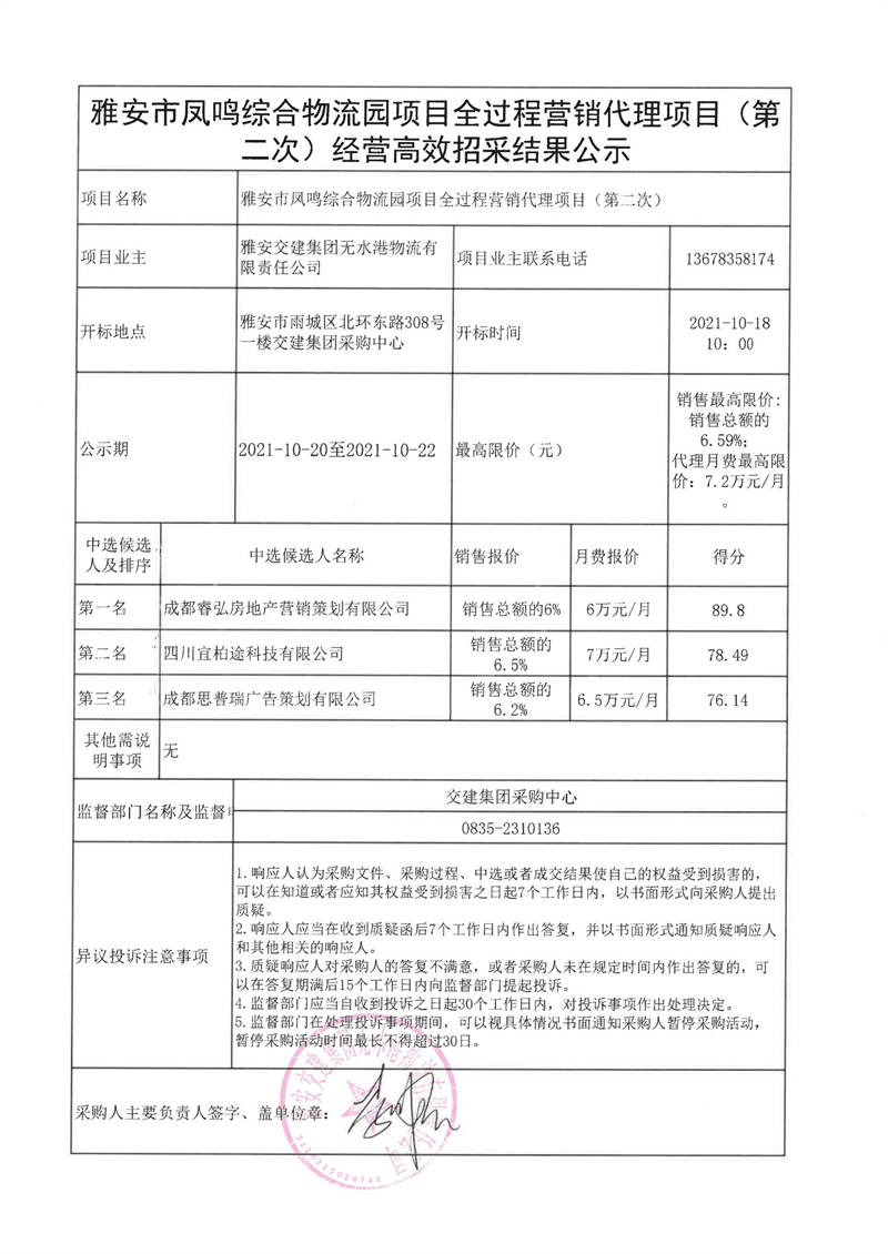 雅安交建集團(tuán)無(wú)水港物流有限責(zé)任公司雅安市鳳鳴綜合物流園項(xiàng)目全過(guò)程營(yíng)銷代理項(xiàng)目(第二次)經(jīng)營(yíng)高效招采結(jié)果公示