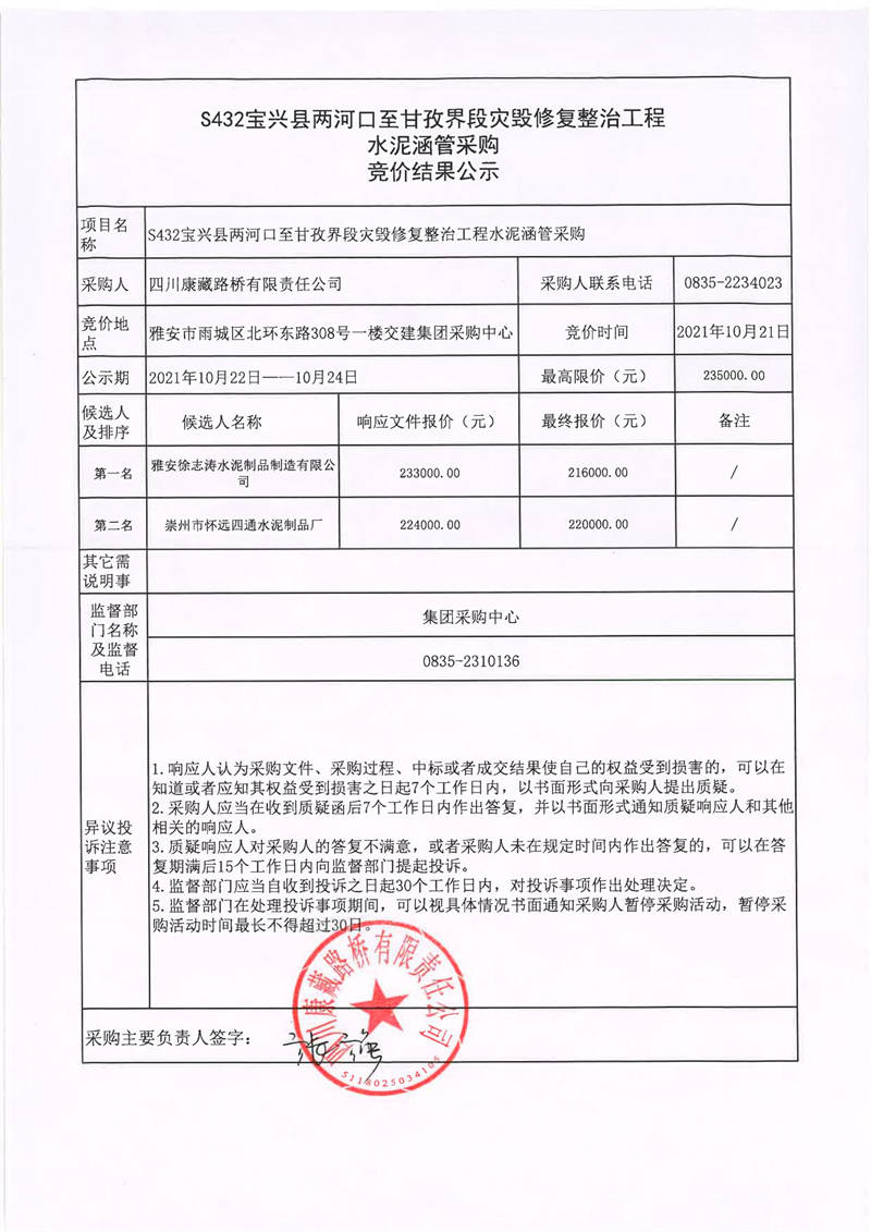 四川康藏路橋有限責(zé)任公司S432線寶興縣兩河口至甘孜界段災(zāi)毀修復(fù)整治工程水泥涵管采購競(jìng)價(jià)結(jié)果公示