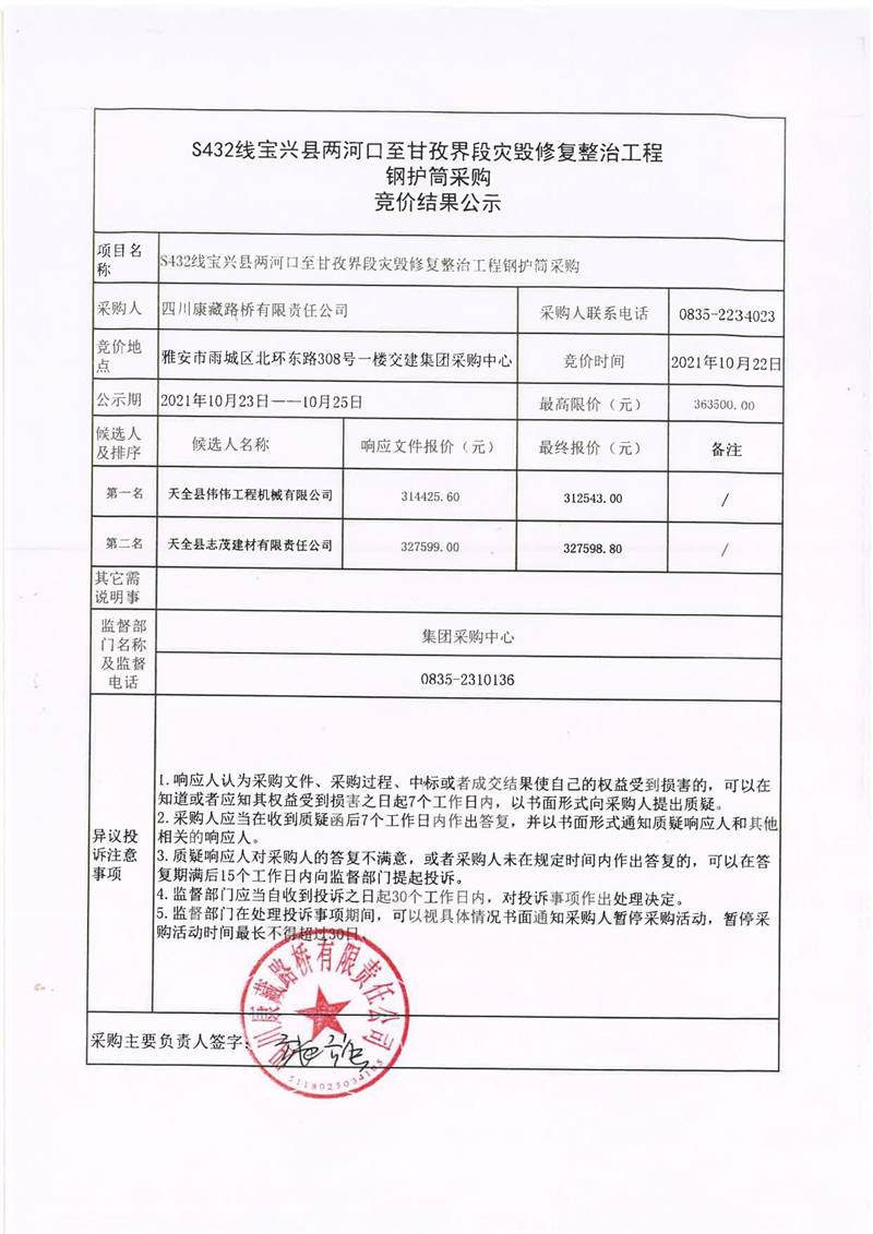 四川康藏路橋有限責任公司S432線寶興縣兩河口至甘孜界段災毀修復整治工程鋼護筒采購競價結(jié)果公示