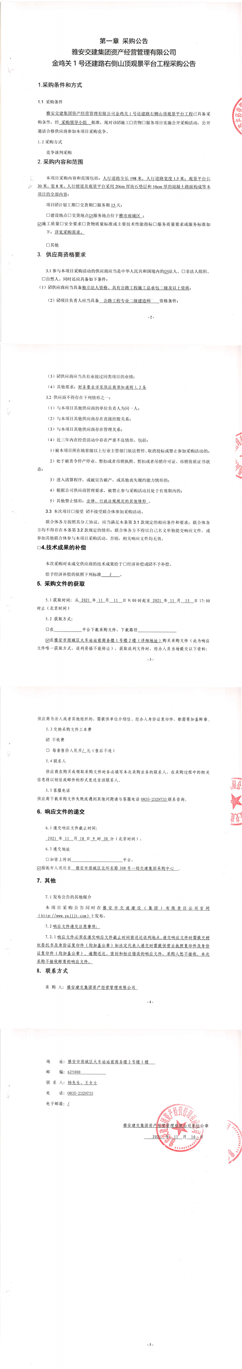 雅安交建集團(tuán)資產(chǎn)經(jīng)營管理有限公司金雞關(guān)1號(hào)還建路右側(cè)山頂觀景平臺(tái)工程采購公告