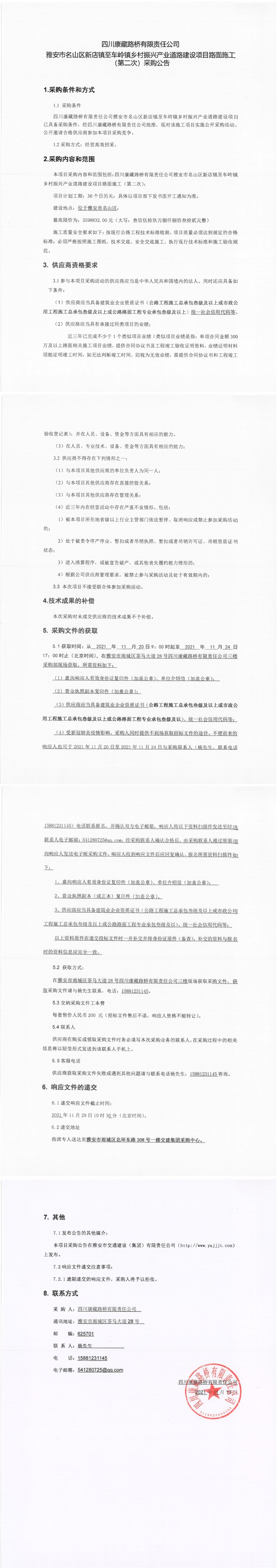 四川康藏路橋有限責(zé)任公司雅安市名山區(qū)新店鎮(zhèn)至車嶺鎮(zhèn)鄉(xiāng)村振興產(chǎn)業(yè)道路建設(shè)項(xiàng)目路面施工(第二次)采購公告