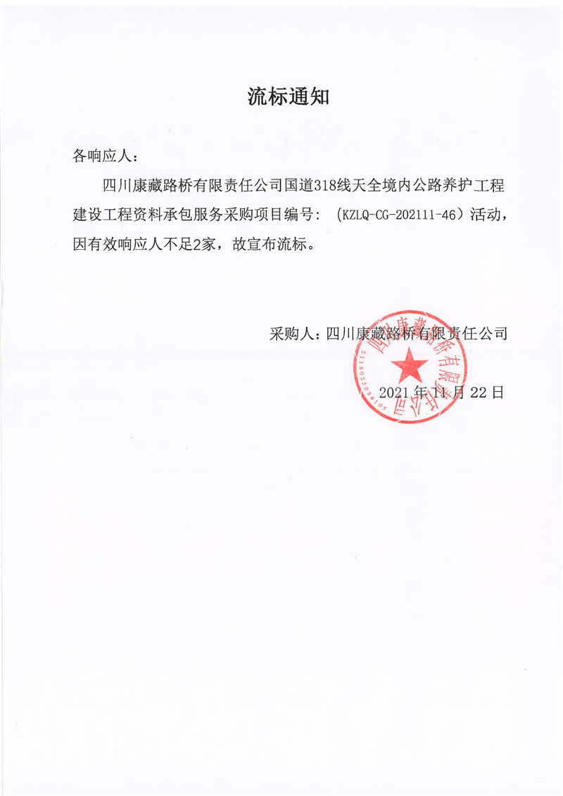 四川康藏路橋有限責任公司國道318線天全境內(nèi)公路養(yǎng)護工程建設(shè)工程資料承包服務采購流標通知