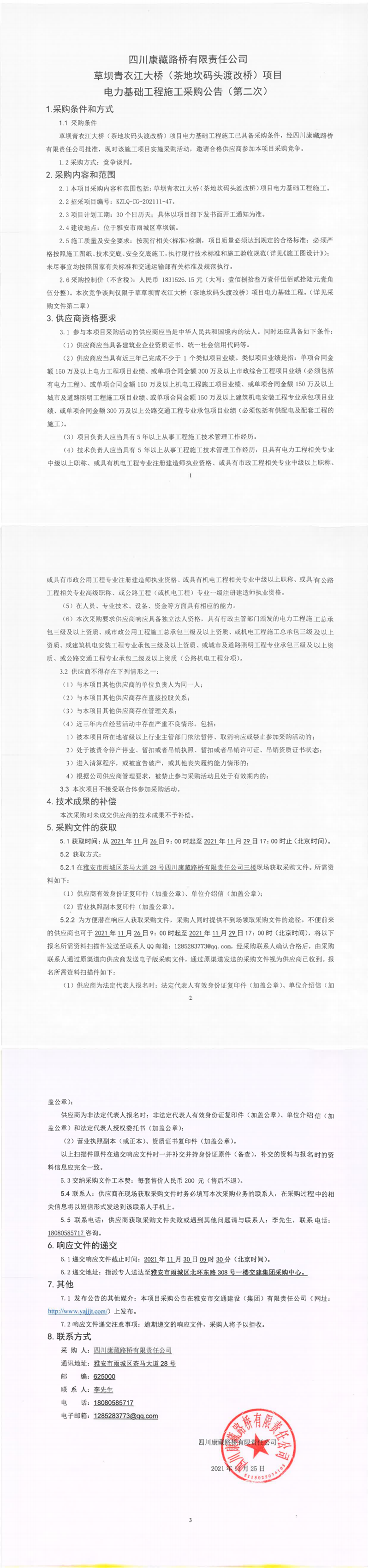 四川康藏路橋有限責(zé)任公司草壩青衣江大橋(茶地坎碼頭渡改橋)項(xiàng)目電力基礎(chǔ)工程施工采購公告(第二次)