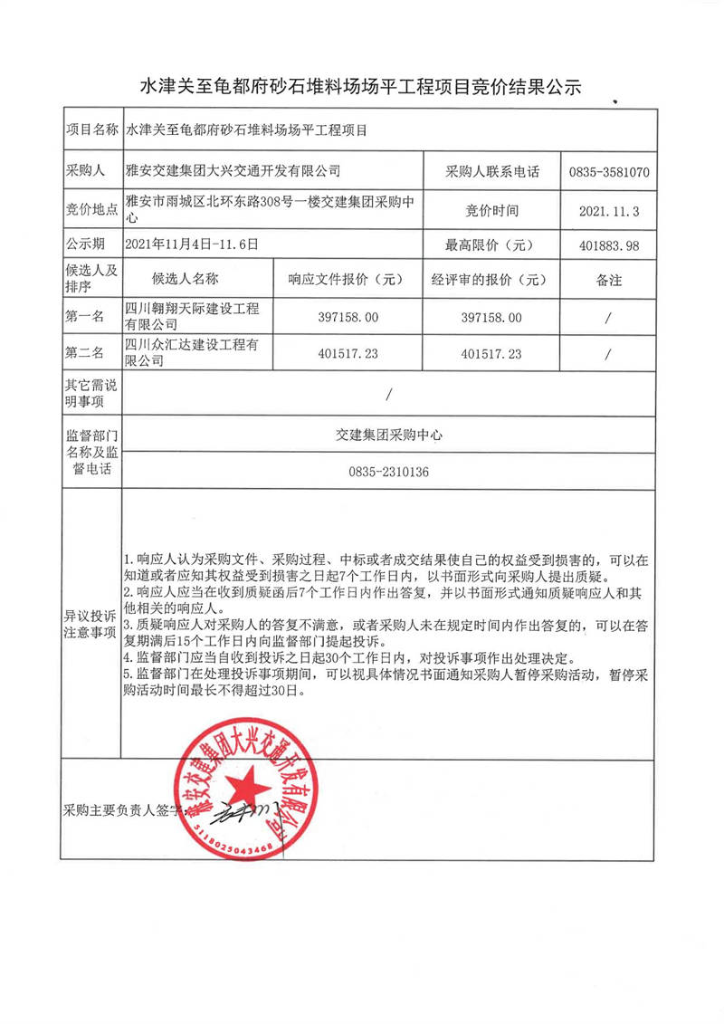 雅安交建集團(tuán)大興交通開發(fā)有限公司水津關(guān)至龜都府砂石堆料場場平工程項目競價結(jié)果公示