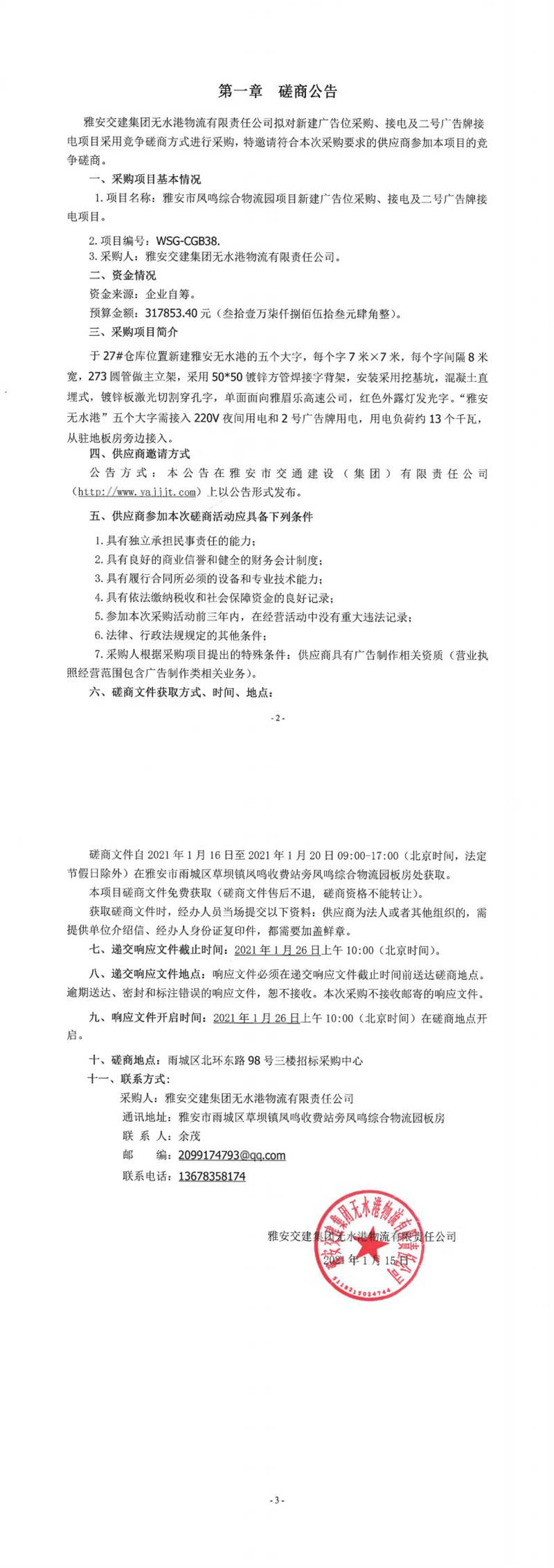 雅安交建集團(tuán)無水港物流有限責(zé)任公司雅安市鳳鳴綜合物流園項(xiàng)目新建廣告位采購、接電及二號(hào)廣告牌接電項(xiàng)目磋商公告