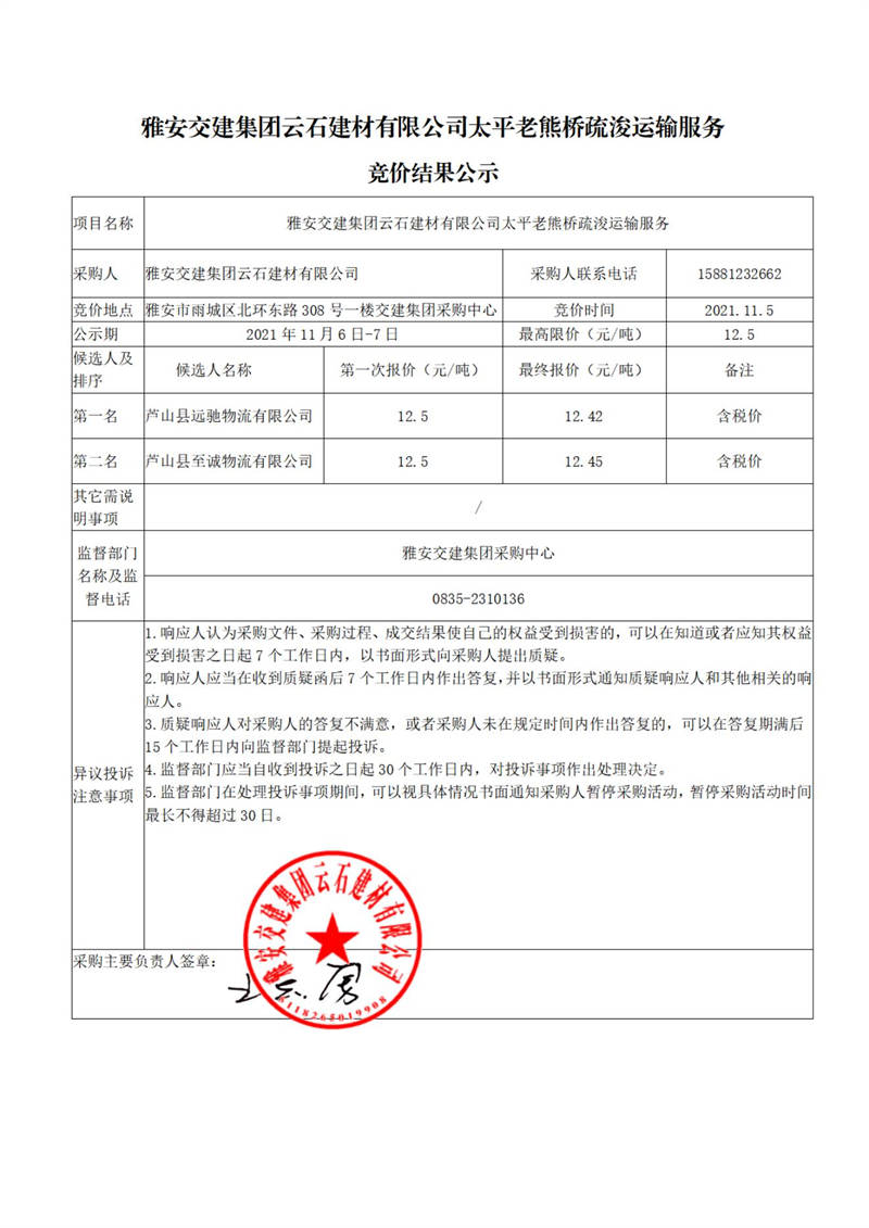 雅安交建集團云石建材有限公司太平老熊橋疏浚運輸服務(wù)競價結(jié)果公示