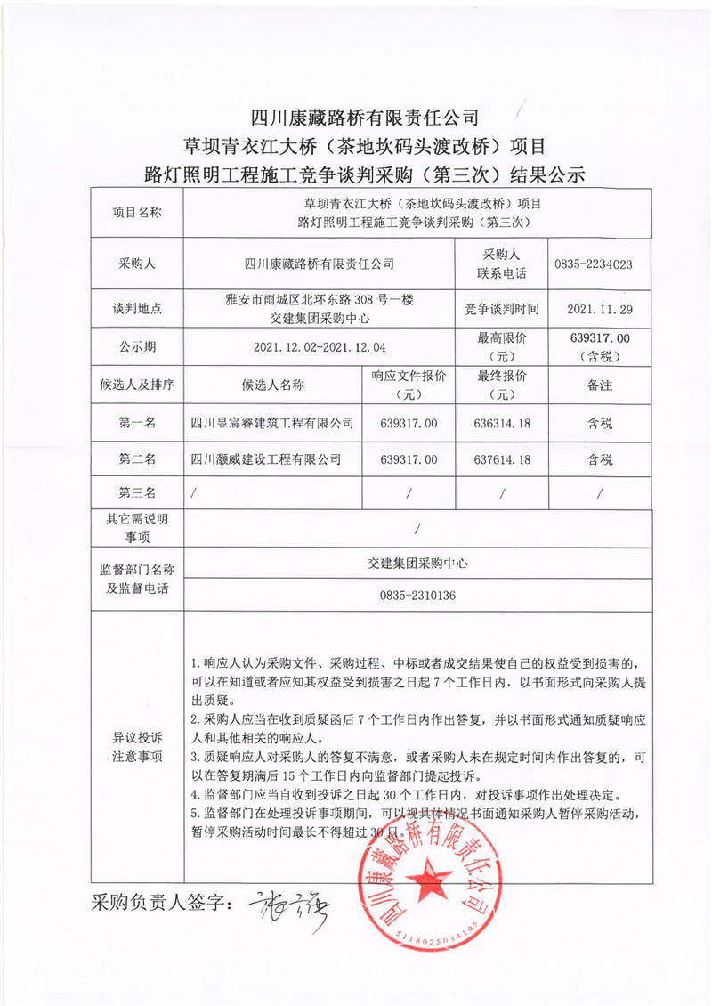 四川康藏路橋有限責(zé)任公司草壩青衣江大橋(茶地坎碼頭渡改橋)項(xiàng)目路燈照明工程施工競(jìng)爭(zhēng)談判采購(gòu)(第三次)結(jié)果公示