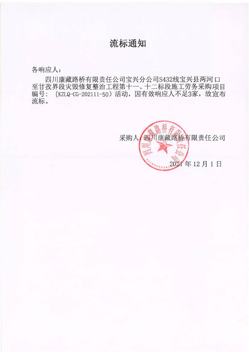 四川康藏路橋有限責(zé)任公司S432線寶興縣兩河口至甘孜界段災(zāi)毀修復(fù)整治工程第十一、十二標(biāo)段施工勞務(wù)采購流標(biāo)通知