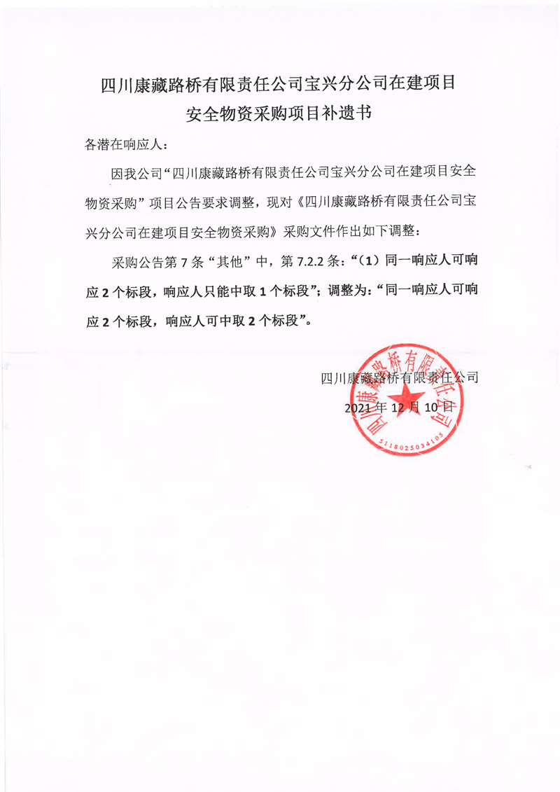 四川康藏路橋有限責(zé)任公司寶興分公司在建項(xiàng)目安全物資采購項(xiàng)目補(bǔ)遺書