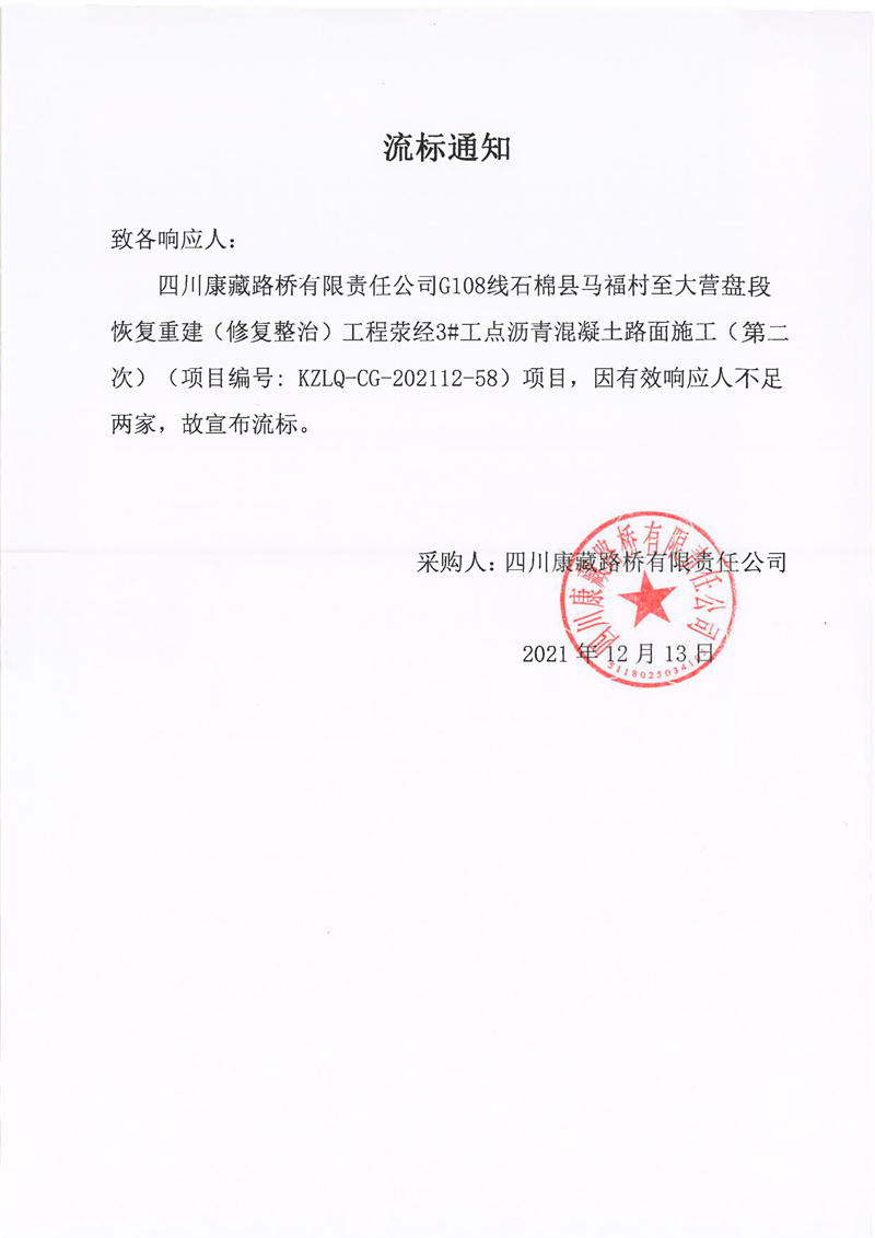四川康藏路橋有限責任公司G108線石棉縣馬福村至大營盤段恢復重建(修復整治)工程滎經(jīng)3#工點瀝青混凝土路面施工(第二次)流標通知