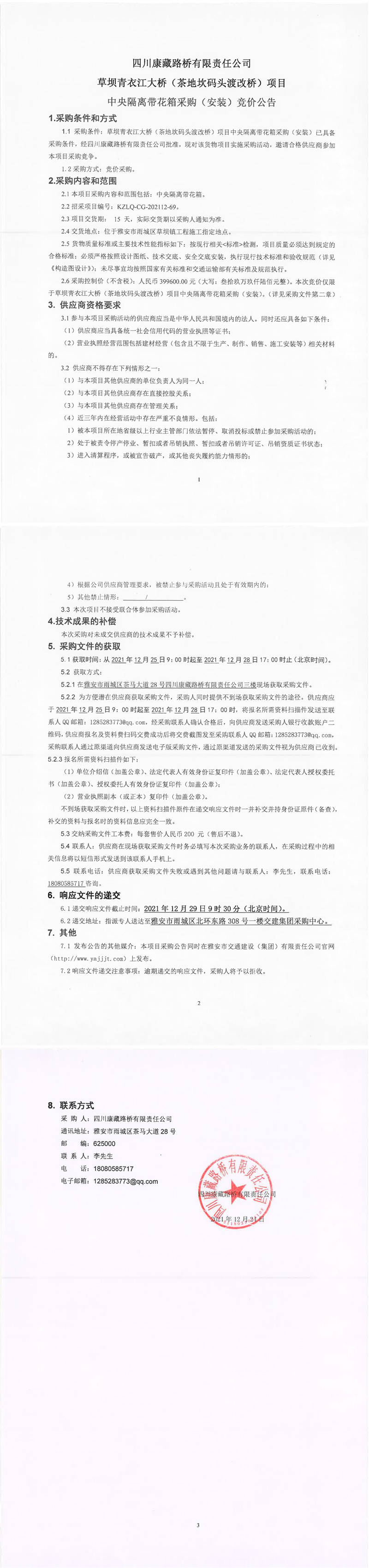 四川康藏路橋有限責(zé)任公司草壩青衣江大橋(茶地坎碼頭渡改橋)項(xiàng)目中央隔離帶花箱采購(安裝)競(jìng)價(jià)公告