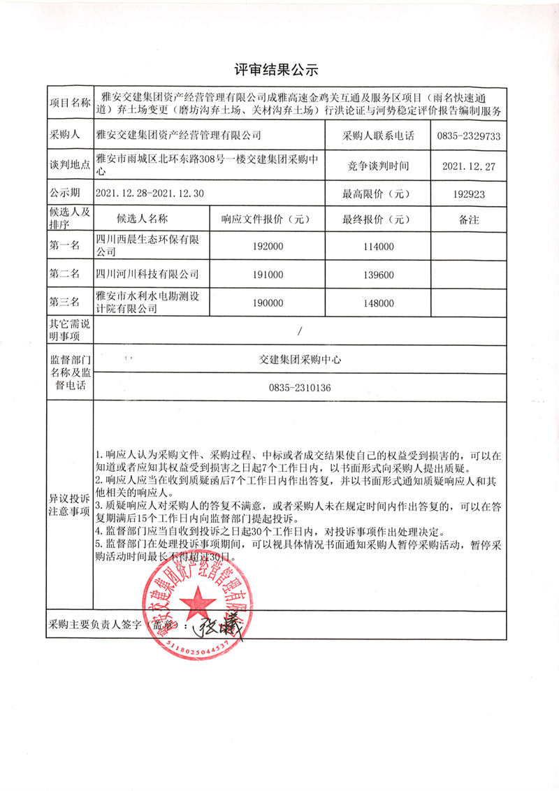 雅安交建集團(tuán)資產(chǎn)經(jīng)營管理有限公司成雅高速金雞關(guān)互通及服務(wù)區(qū)項目(雨名快速通道)棄土場變更(磨坊溝棄土場、關(guān)材溝棄土場)行洪論證與河勢穩(wěn)定評價報告編制服務(wù)評審結(jié)果公示