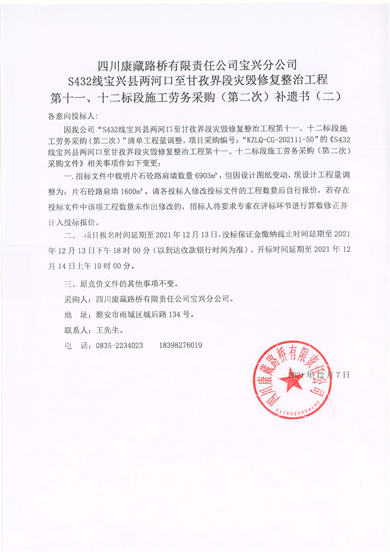 四川康藏路橋有限責(zé)任公司寶興分公司S432線寶興縣兩河口至甘孜界段災(zāi)毀修復(fù)整治工程第十一、十二標段施工勞務(wù)采購(第二次)補遺書(二)