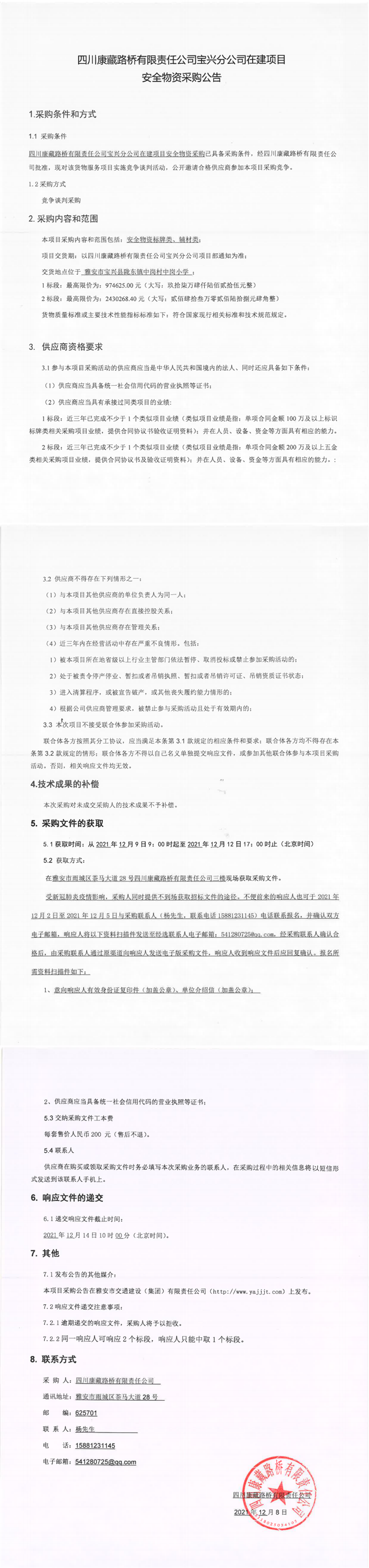 四川康藏路橋有限責任公司寶興分公司在建項目安全物資采購