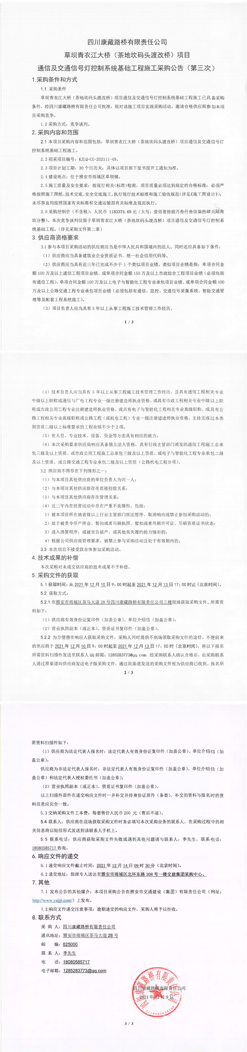 四川康藏路橋有限責(zé)任公司草壩青衣江大橋(茶地坎碼頭渡改橋)項(xiàng)目通信及交通信號燈控制系統(tǒng)基礎(chǔ)工程施工采購公告(第三次)