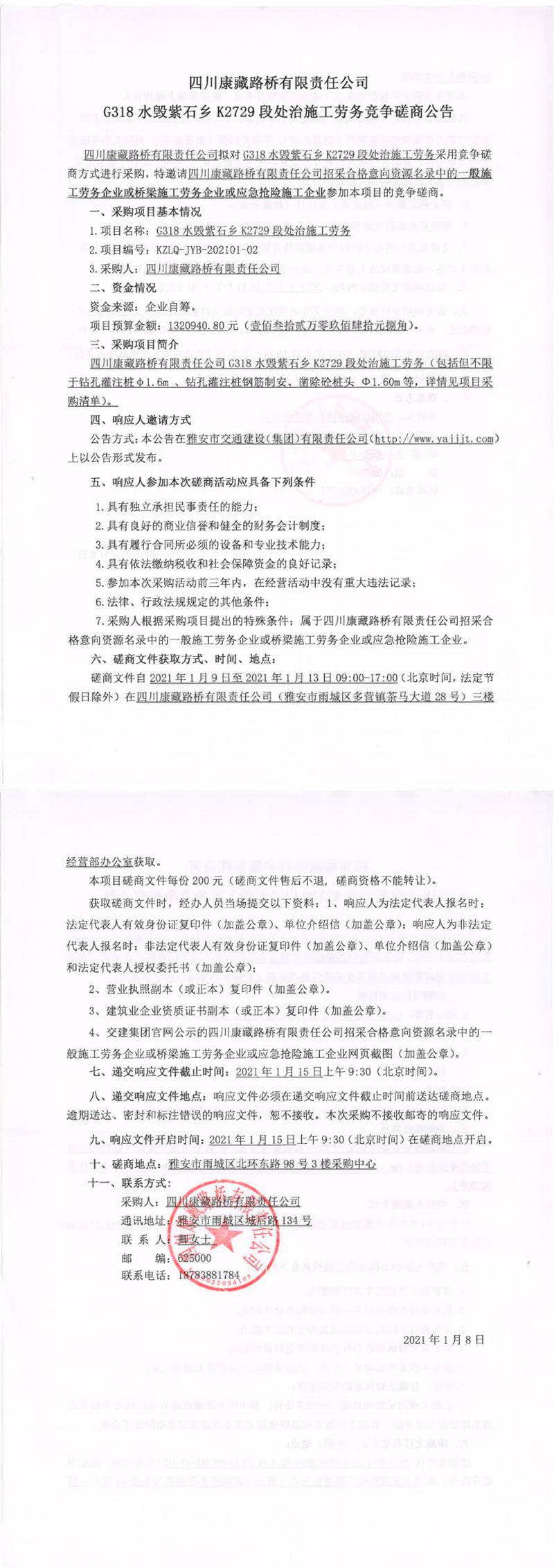 四川康藏路橋有限責(zé)任公司G318水毀紫石鄉(xiāng)K2729段處治施工勞務(wù)競(jìng)爭(zhēng)磋商公告