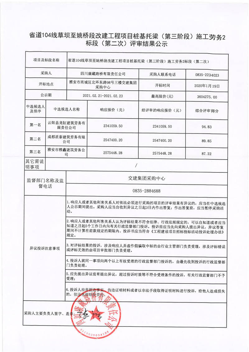 四川康藏路橋有限責(zé)任公司省道104線草壩至姚橋段改建工程項(xiàng)目樁基托梁(第三階段)施工勞務(wù)2標(biāo)段(第二次)評(píng)審結(jié)果公示