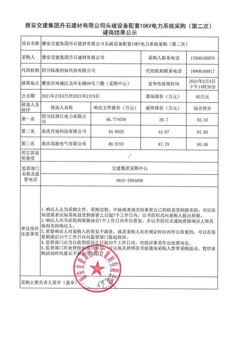雅安交建集團丹石建材有限公司頭破設備配套10KV電力系統(tǒng)采購(第二次)磋商結(jié)果公示