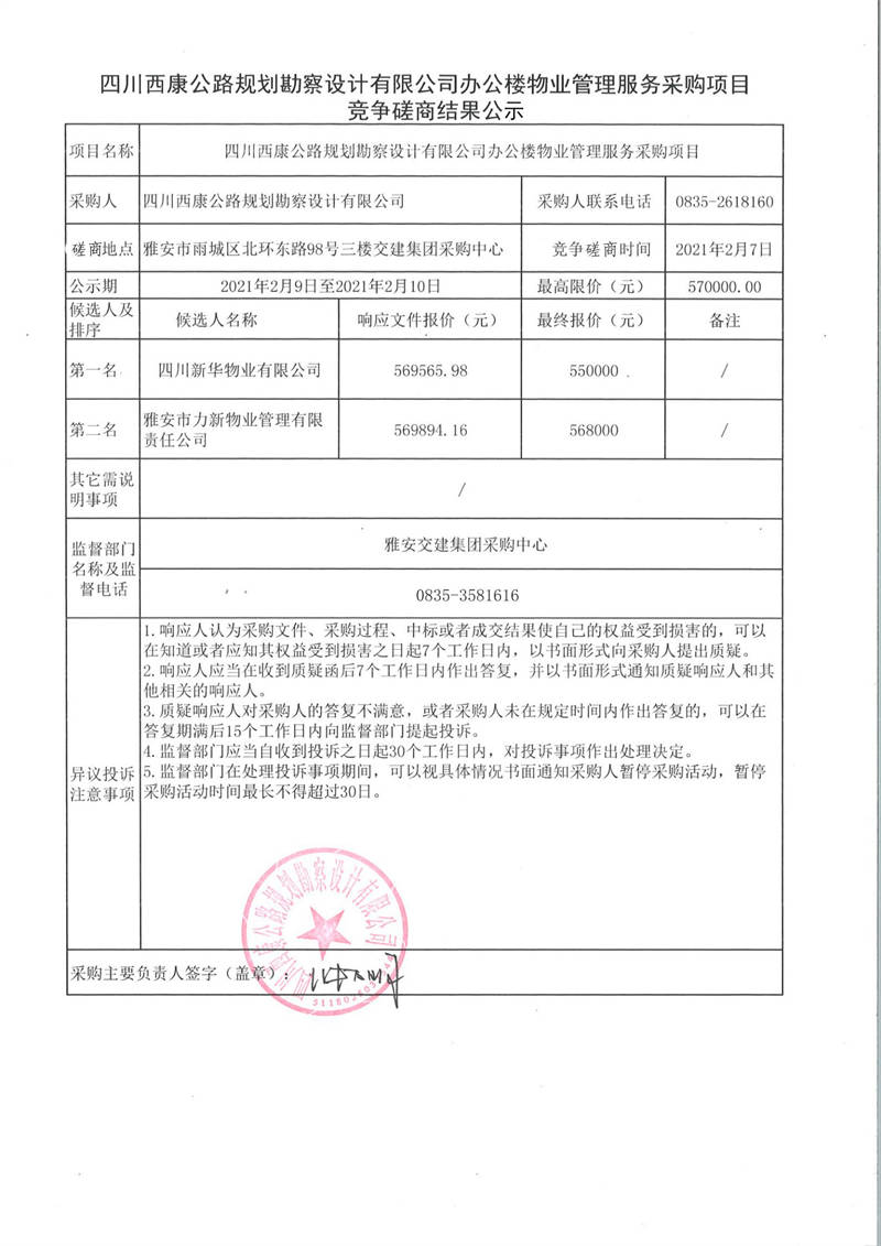 四川西康公路規(guī)劃勘察設(shè)計(jì)有限公司辦公樓物業(yè)管理服務(wù)采購(gòu)項(xiàng)目競(jìng)爭(zhēng)磋商結(jié)果公示