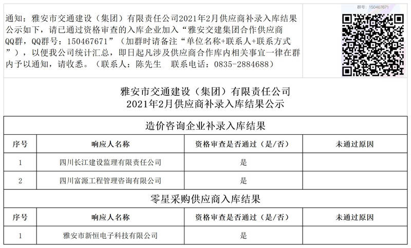 雅安市交通建設(shè)(集團)有限責(zé)任公司2021年2月供應(yīng)商補錄入庫結(jié)果公示