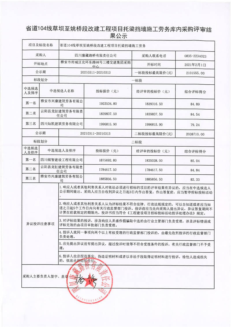 四川康藏路橋有限責(zé)任公司省道104線(xiàn)草壩至姚橋段改建工程項(xiàng)目托梁擋墻施工勞務(wù)庫(kù)內(nèi)采購(gòu)評(píng)審結(jié)果公示