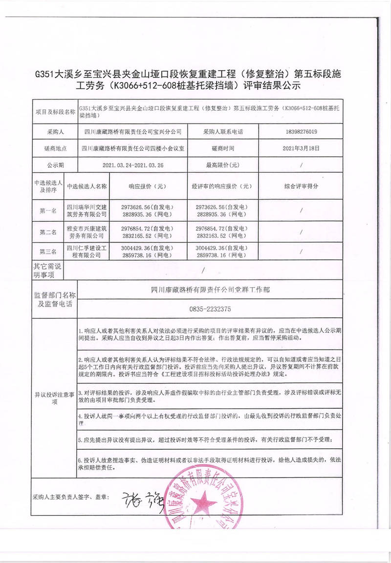 四川康藏路橋有限責任公司寶興分公司G351大溪鄉(xiāng)至寶興縣夾金山埡口段恢復重建工程(修復整治)第五標段施工勞務(k3066+512-608樁基托梁擋墻)評審結果公示