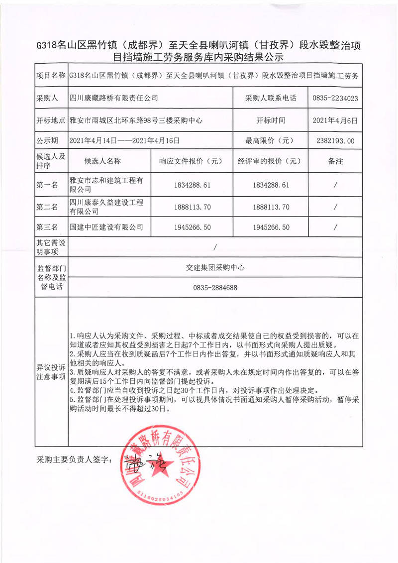 四川康藏路橋有限責(zé)任公司G318名山區(qū)黑竹鎮(zhèn)(成都界)至天全縣喇叭河鎮(zhèn)(甘孜界)段水毀整治項目擋墻施工勞務(wù)服務(wù)庫內(nèi)采購結(jié)果公示