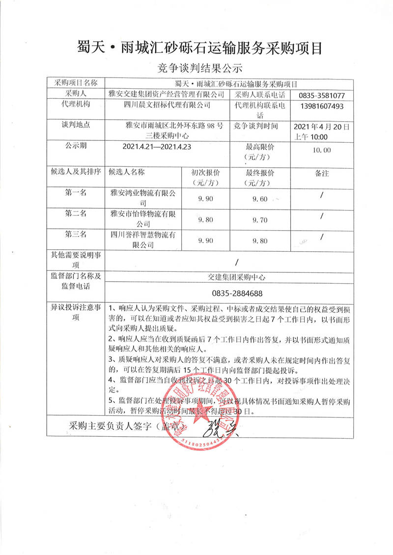 雅安交建集團(tuán)資產(chǎn)經(jīng)營管理有限公司蜀天.雨城匯砂礫石運(yùn)輸服務(wù)采購項(xiàng)目競爭談判結(jié)果公示