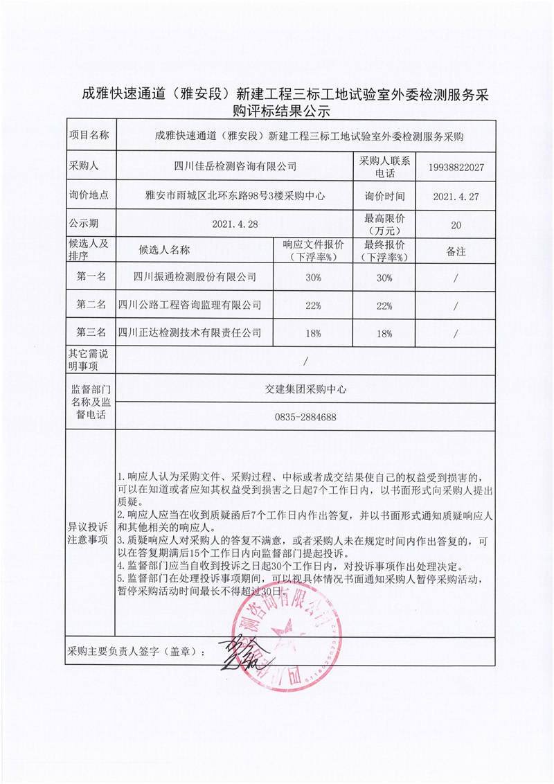 四川佳岳檢測(cè)咨詢有限公司成雅快速通道(雅安段)新建工程三標(biāo)工地試驗(yàn)室外委檢測(cè)服務(wù)采購(gòu)評(píng)標(biāo)結(jié)果公示