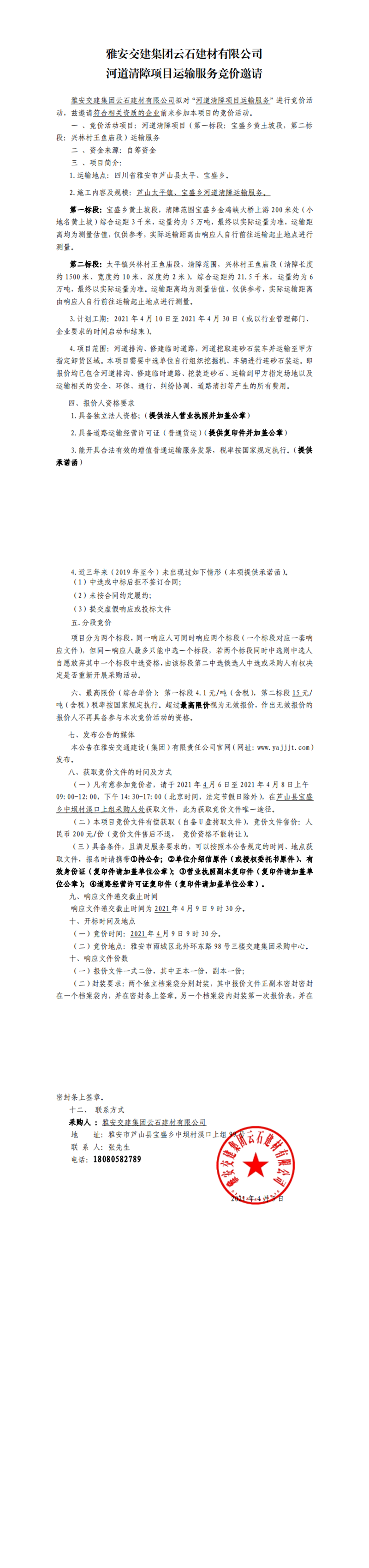 雅安交建集團(tuán)云石建材有限公司河道清障項(xiàng)目運(yùn)輸服務(wù)競(jìng)價(jià)公告