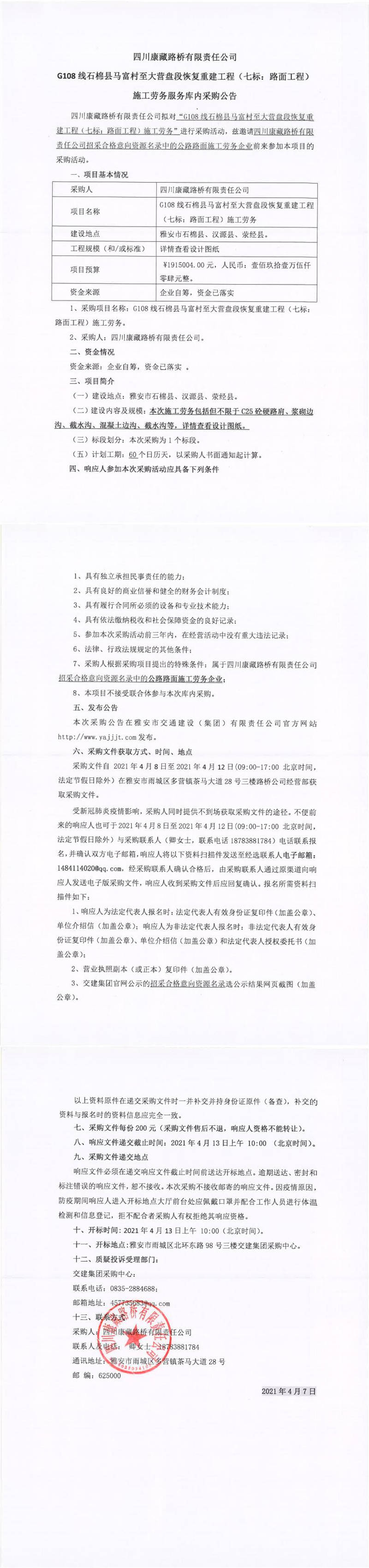 四川康藏路橋有限責任公司G108線石棉縣馬富村至大營盤段恢復重建工程(七標:路面工程)施工勞務服務庫內采購公告