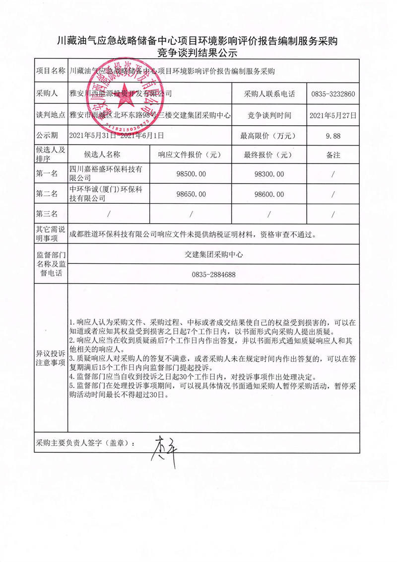 雅安川西能源投資開發(fā)有限公司川藏油氣應(yīng)急戰(zhàn)略儲(chǔ)備中心項(xiàng)目環(huán)境影響評(píng)價(jià)報(bào)告編制服務(wù)采購(gòu)競(jìng)爭(zhēng)性談判結(jié)果公示