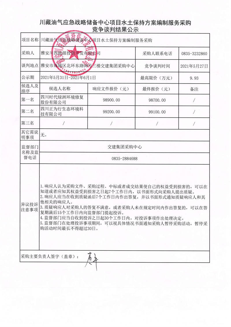 雅安川西能源投資開(kāi)發(fā)有限公司川藏油氣應(yīng)急戰(zhàn)略儲(chǔ)備中心項(xiàng)目水土保持方案編制服務(wù)采購(gòu)競(jìng)爭(zhēng)談判結(jié)果公示