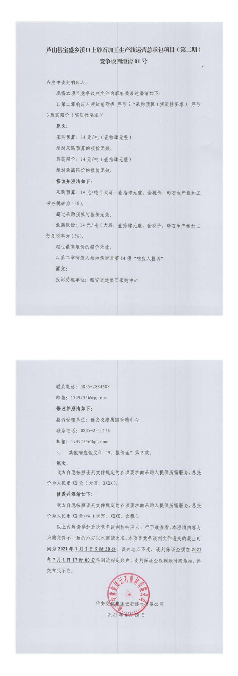 雅安交建集團云石建材有限公司蘆山縣寶盛鄉(xiāng)溪口上砂石加工生產(chǎn)線運營總承包項目(第二期)競爭談判澄清公告