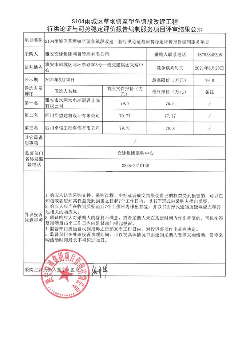 雅安交建集團項目管理有限公司S104雨城區(qū)草壩鎮(zhèn)至望魚鎮(zhèn)段改建工程行洪論證與河勢穩(wěn)定評價報告編制服務項目評審結果公示