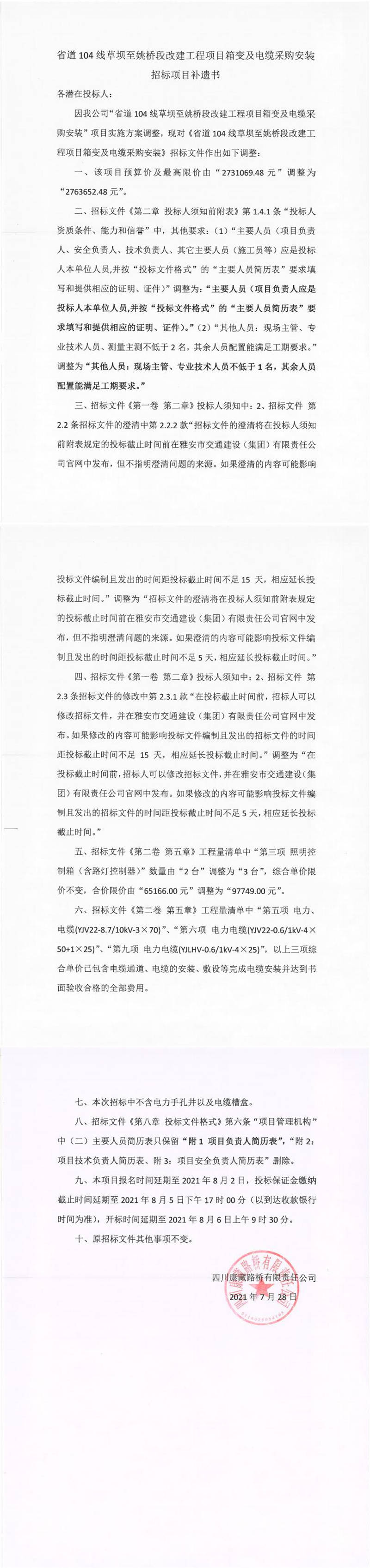 四川康藏路橋有限責(zé)任公司省道104線草壩至姚橋段改建項(xiàng)目箱變及電纜采購安裝招標(biāo)項(xiàng)目補(bǔ)遺書
