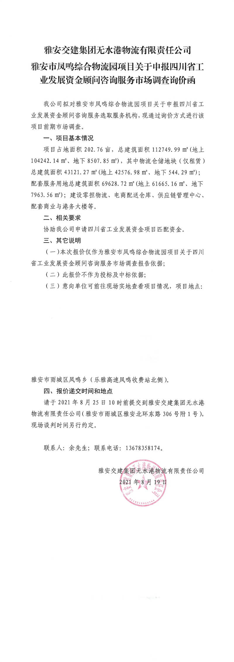 雅安交建集團(tuán)無(wú)水港物流有限責(zé)任公司雅安市鳳鳴綜合物流園項(xiàng)目關(guān)于申報(bào)四川省工業(yè)發(fā)展資金顧問(wèn)咨詢服務(wù)市場(chǎng)調(diào)查詢價(jià)函