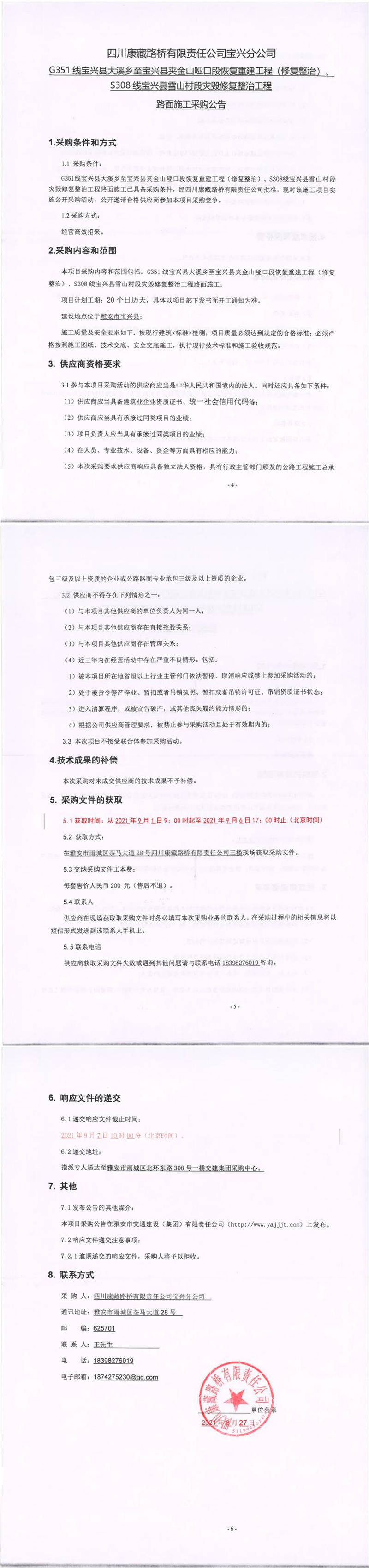 四川康藏路橋有限責(zé)任公司寶興分公司G351線(xiàn)寶興縣大溪鄉(xiāng)至寶興縣夾金山啞口段恢復(fù)重建工程(修復(fù)整治)、S308線(xiàn)寶興縣雪山村段災(zāi)毀修復(fù)整治工程路面施工采購(gòu)公告