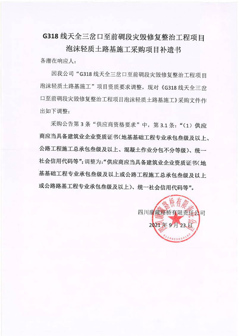 四川康藏路橋有限責任公司G318線天全三岔口至前碉段災毀修復整治工程項目泡沫輕質土路基施工采購項目補遺書