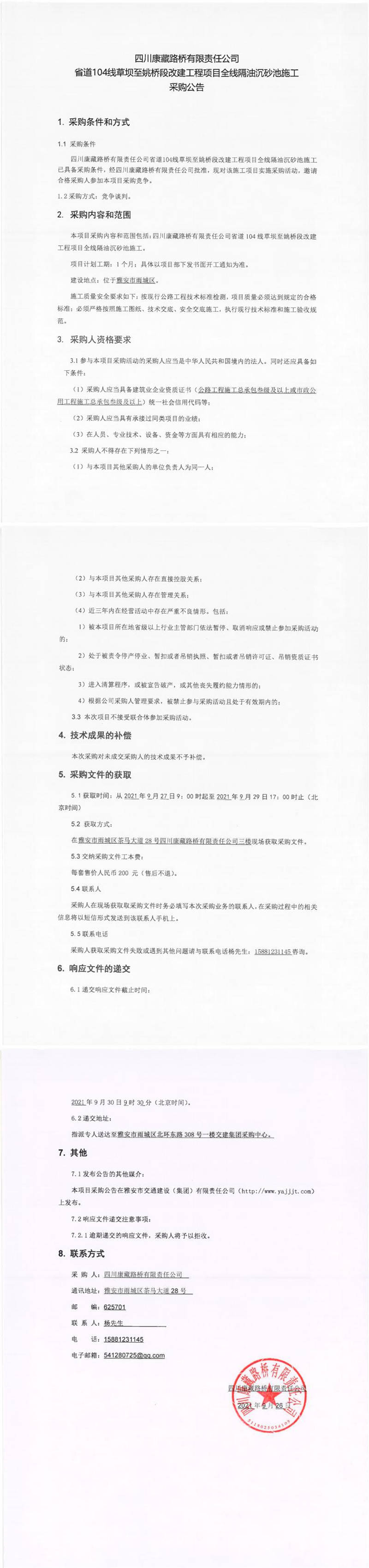 四川康藏路橋有限責(zé)任公司省道104線草壩至姚橋段改建工程項(xiàng)目全線隔油沉砂池施工采購公告
