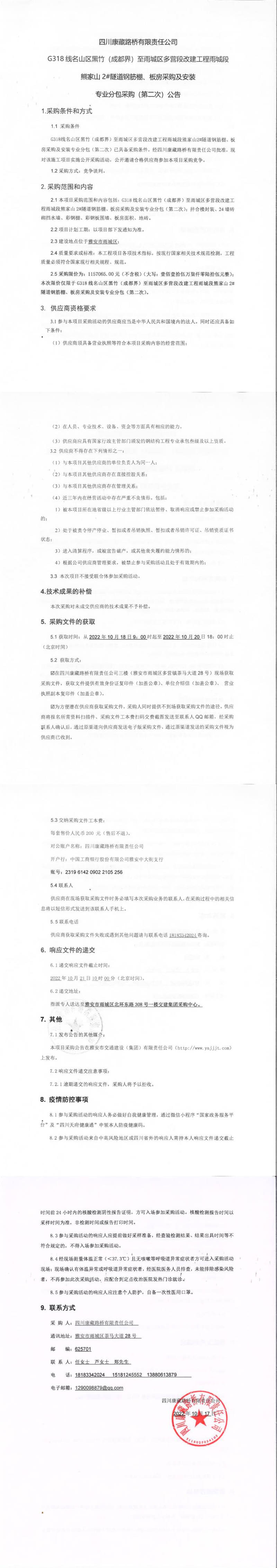 四川康藏路橋有限責(zé)任公司G318線名山區(qū)黑竹(成都界)至雨城區(qū)多營(yíng)段改建工程雨城段熊家山2#隧道鋼筋棚、板房采購(gòu)及安裝專業(yè)分包采購(gòu)(第二次)公告