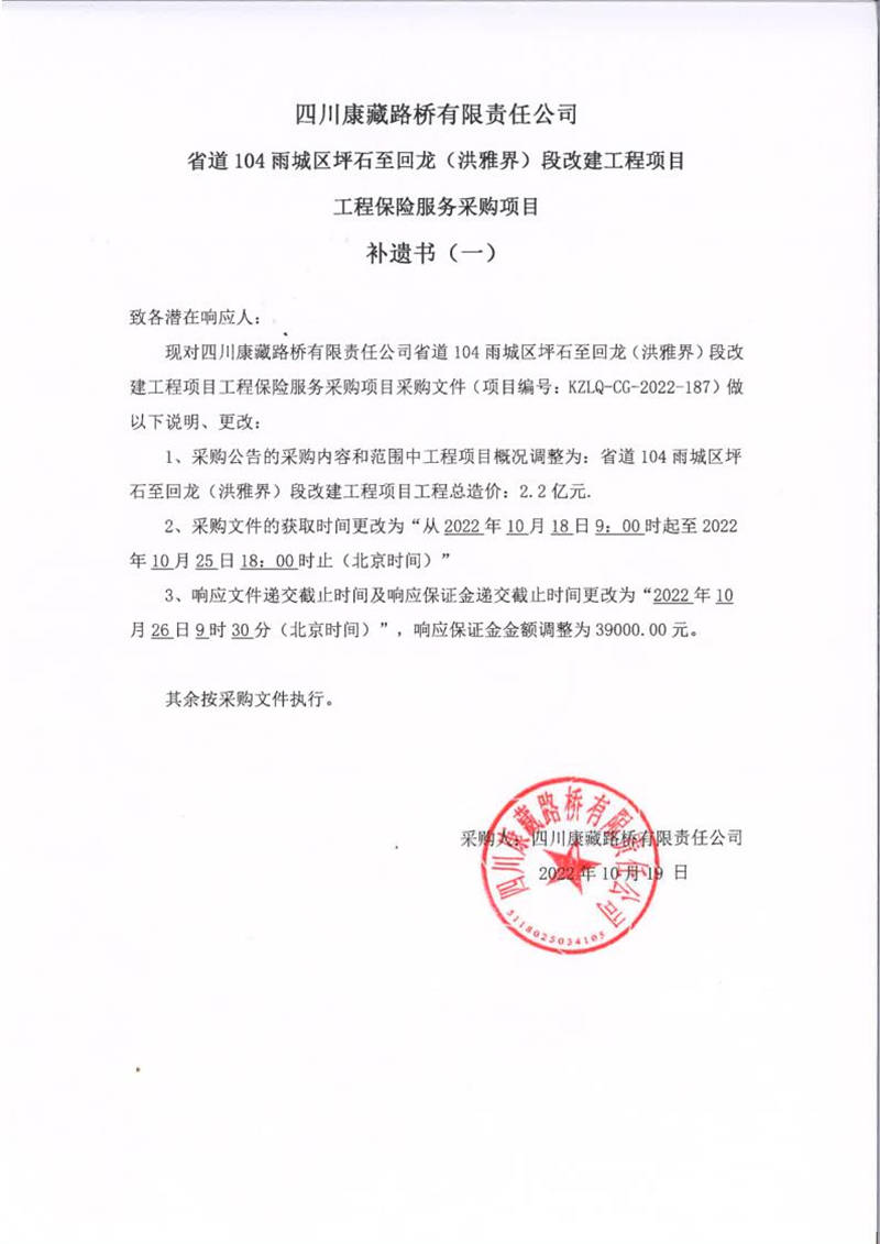 四川康藏路橋有限責任公司省道104雨城區(qū)坪石至回龍(洪雅界)段改建工程項目工程保險服務(wù)采購項目補遺書(一)