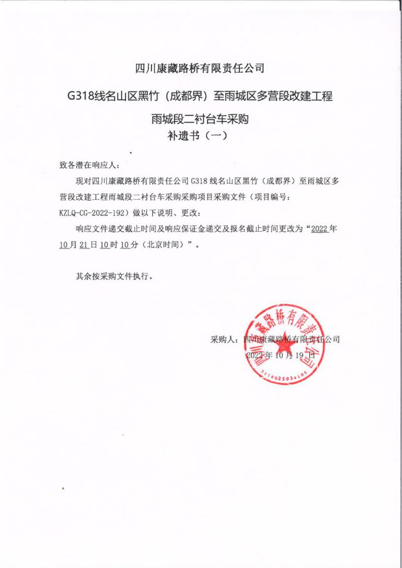 四川康藏路橋有限責(zé)任公司G318線名山區(qū)黑竹(成都界)至雨城區(qū)多營(yíng)段改建工程雨城段二襯臺(tái)車(chē)采購(gòu)補(bǔ)遺書(shū)(一)