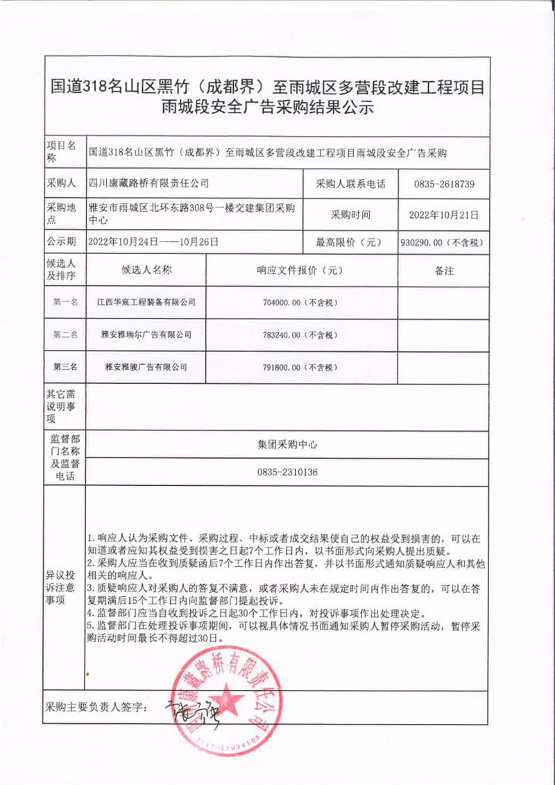 四川康藏路橋有限責(zé)任公司國道318名山區(qū)黑竹(成都界)至雨城區(qū)多營段改建工程項目雨城段安全廣告采購結(jié)果公示
