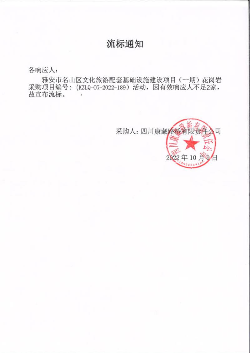四川康藏路橋有限責(zé)任公司雅安市名山區(qū)文化旅游配套基礎(chǔ)設(shè)施建設(shè)項目(一期)花崗巖采購項目流標(biāo)通知